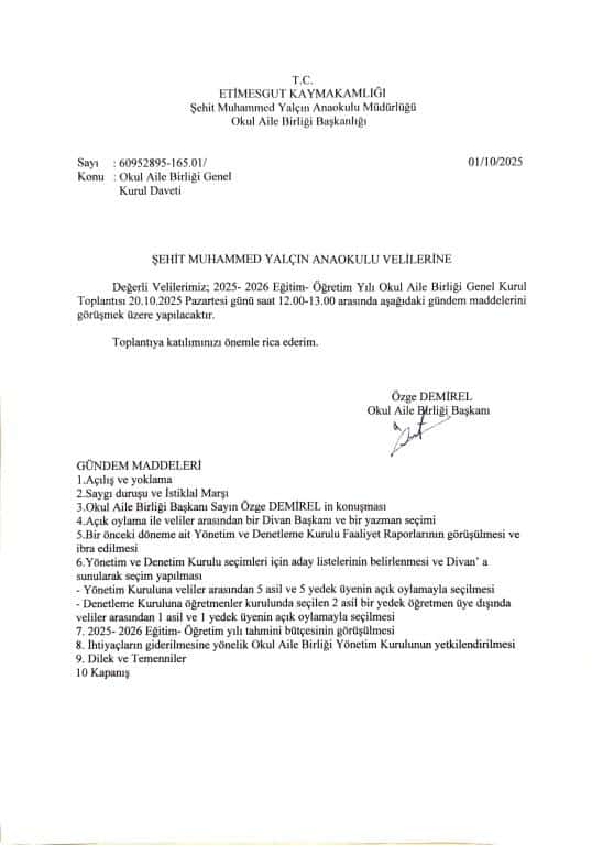 20.10.2025 Pazartesi günü yapılacak olan Okul Aile Birliği Genel Kurul Toplantısına katılımınızı önemle rica ederiz.